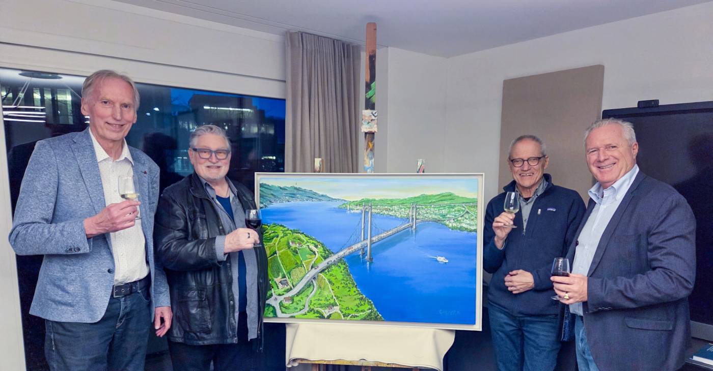 Das Gemälde von Renato Hauser zeigt eine visionäre Hängebrücke zwischen Au und Meilen - ein historisch inspiriertes, nie realisiertes Ingenieurprojekt, das den Pioniergeist früherer Ingenieurgenerationen eindrucksvoll widerspiegelt.