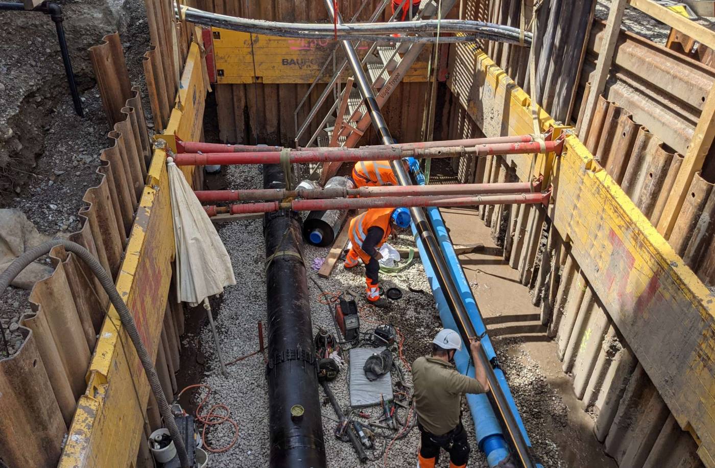 Die Wasserversorgung Meggen ersetzt ihre über 100-jährige Transportwasserleitung DN 200 mm, welche das Quellgebiet Lauerz mit Meggen verbindet. Das Projekt erstreckt sich durch das Dorf (l=750 m). Die Werke nutzten die Gelegenheit, um ihre Netze zu erneuern. Der Bezirk sanierte gleichzeitig die Strassenanlage, baute eine Bushaltestelle gemäss BehiG um und realisierte zwei Trennsysteme. Eine Herausforderung war die Unterstossung des Giessenbaches mit mehreren Medien. Dafür mussten zwei fünf Meter tiefe Baugruben im Grundwasserspiegel erstellt werden.