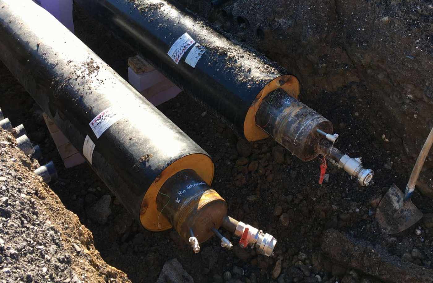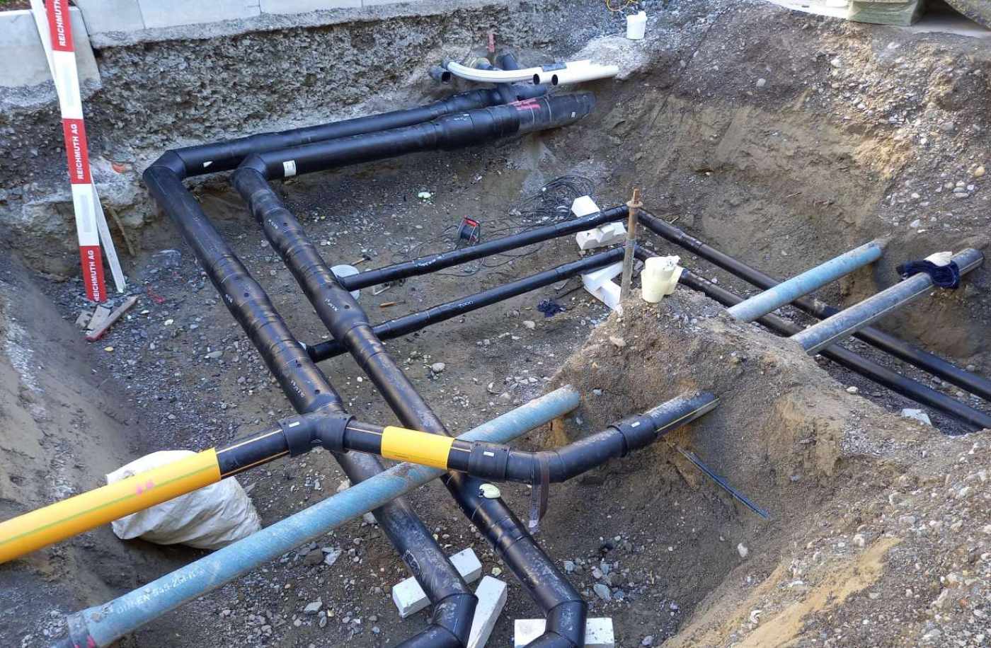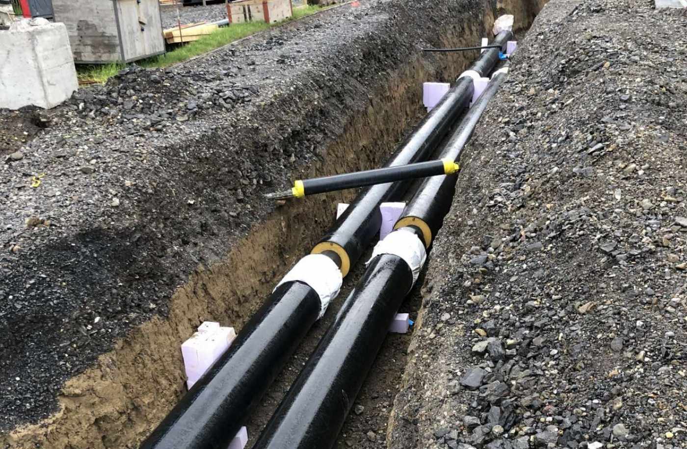 Im offenen Leitungsgraben werden zwei parallele Fernwärmerohre verlegt. Die Wassertemperatur beträgt max. 130°C. im Vorlauf und 50-65°C. im Rücklauf. Zusätzlich werden Kabelschutzrohre für die Steuerleitung mitverlegt. Zur Unterquerung von Strassen und Bächen sind Press- und Spülbohrungen vorgesehen.