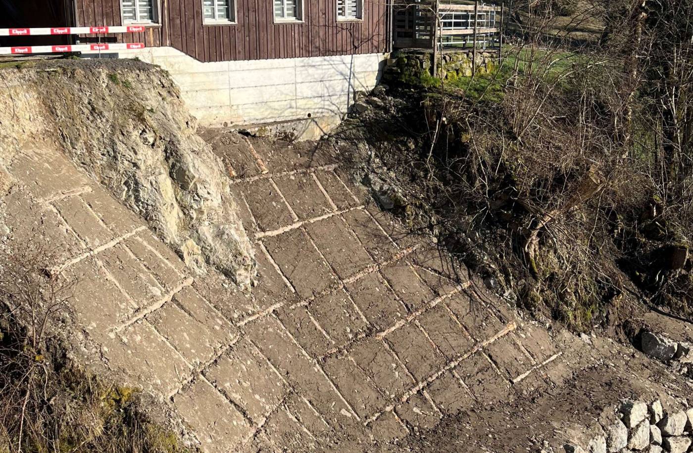 Mit dem Bau eines Uferblocksatzes, eines Holzhangrost und der Vernagelung und Netzabdeckung des stark verwitterten Felsvorsprunges. Kann der bestehende Zustand weiter erhalten und ohne Gefahr genutzt werden. Nach Abschluss der Bauarbeiten wurde der ganze Hangbereich wieder bestockt mit einheimischer Uferbepflanzung.