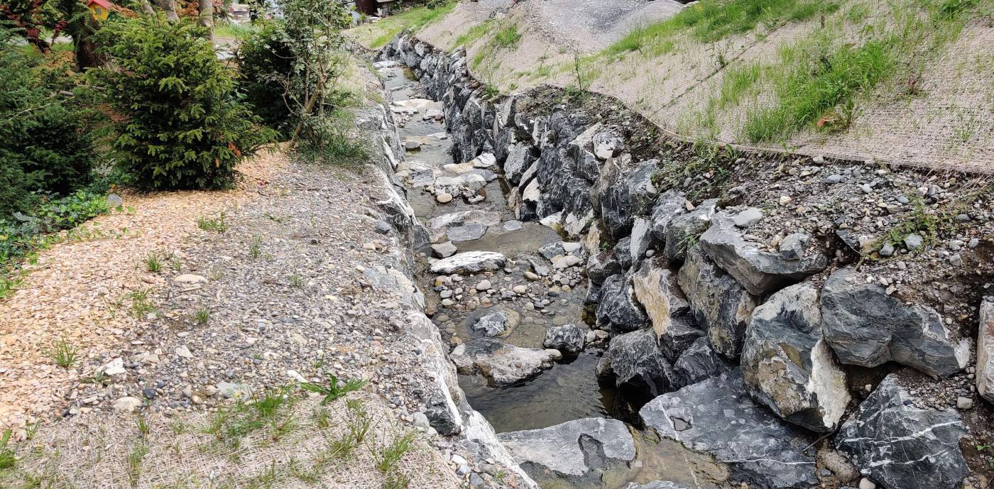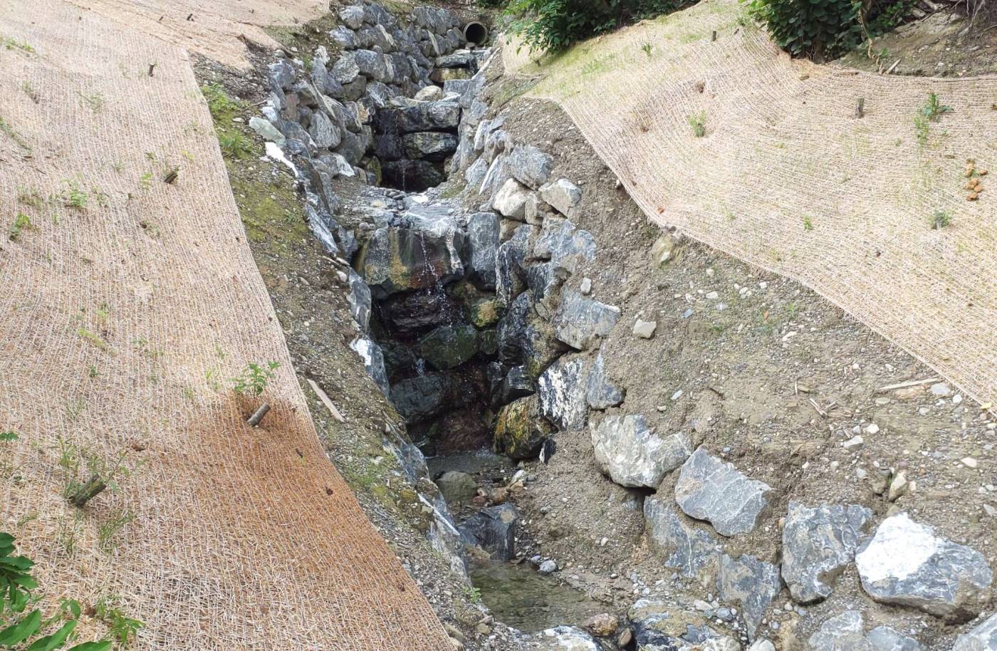 Der Grenzbach entspringt im Siedlungsgebiet von Wollerau und fliesst in einer steileren Strecke in Richtung Zürichsee. Auf dem Weg in den See sind heute diverse Strecken eingedolt. In den offenen Abschnitten ist die Ufer- und Sohlensicherung schadhaft und teilweise verfault. Zudem sind die Uferbereiche sehr steil und dementsprechend der ökologische Zustand mangelhaft. Mit dem Projekt erfolgte ein Bachneubau über ca. 150 m mit flacheren Ufern und einer ökologischen Aufwertung. Zudem wurden Eindolungen unter der Strasse vergrössert und mit beweglichen Sohlen versehen bzw. eine Strecke von 50 m offengelegt. Im Unterlauf erfolgte eine örtliche Instandstellung inkl. Verbesserung des Hochwasserschutzes sowie Umgestaltungen der Einlaufbauwerke.