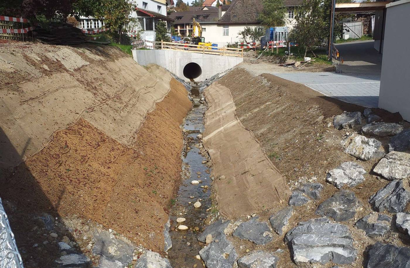 Die Geoinfra Ingenieure AG wurde mit dem hochwassersicheren Ausbau des Russiker Dorfbaches beauftragt. Aufgrund der mehrheitlichen engen und dich tbebauten Platzverhältnissen in der Kernzone und der topographischen Verhältnisse ist eine Ausdolung und gleichzeitige ökologische Aufwertung nur sehr bedingt und in kurzen Teilabschnitten möglich. Ergänzend wird der Ebniweg, kommunaler Fuss-und Wanderweg, ausgebaut und die Mischwasserkanalisation Unterdorf verlegt.