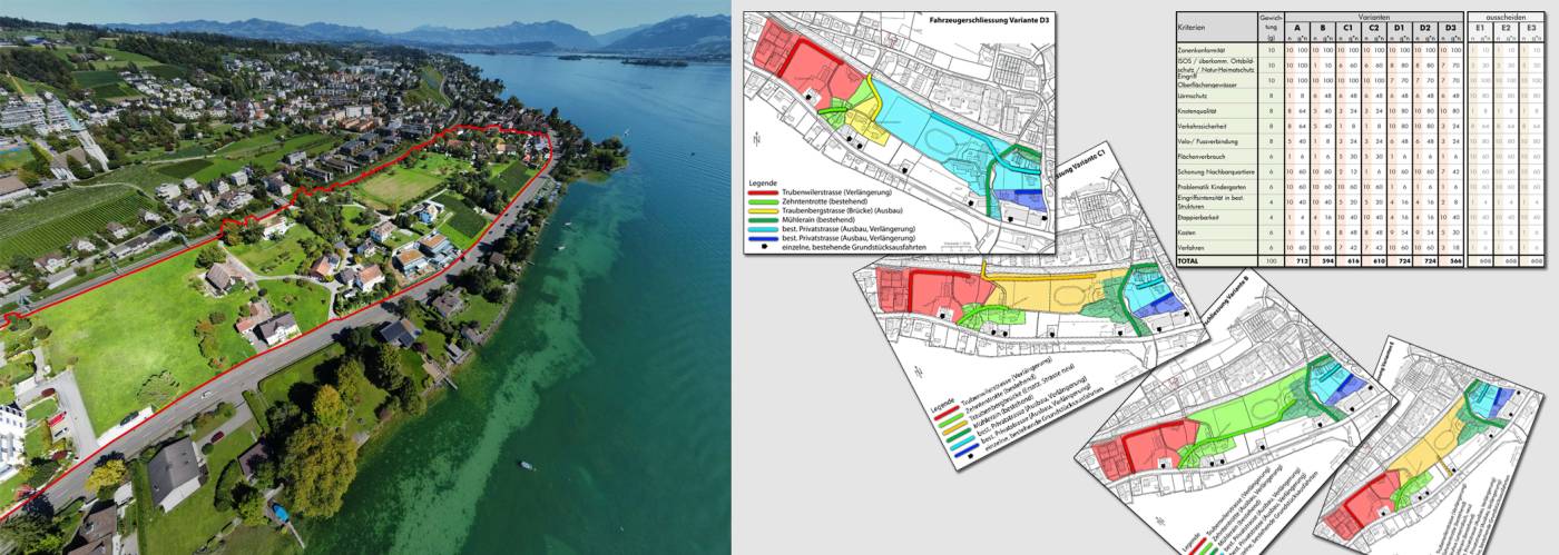 An bester Aussichtslage, jedoch räumlich eingezwängt zwischen Bahnlinie und Seestrasse (Kantonsstrasse), musste für den künftigen Quartierplan "Zehntentrotte" in Stäfa eine geeignete Erschliessungslösung erarbeitet werden. Das Areal umfasst 99.200 m², liegt im ISOS-Gebiet, wird von zwei Bächen durchflossen und beinhaltet ein Ortsbild von überkommunaler Bedeutung mit mehreren denkmalgeschützten Gebäuden sowie einem inventarisierten Baumbestand. Insgesamt zehn Erschliessungsvarianten wurden im Rahmen einer Interessenabwägung anhand von 14 nach Bedeutung gewichteten Kriterien miteinander verglichen, um daraus die Bestvariante zu bestimmen.